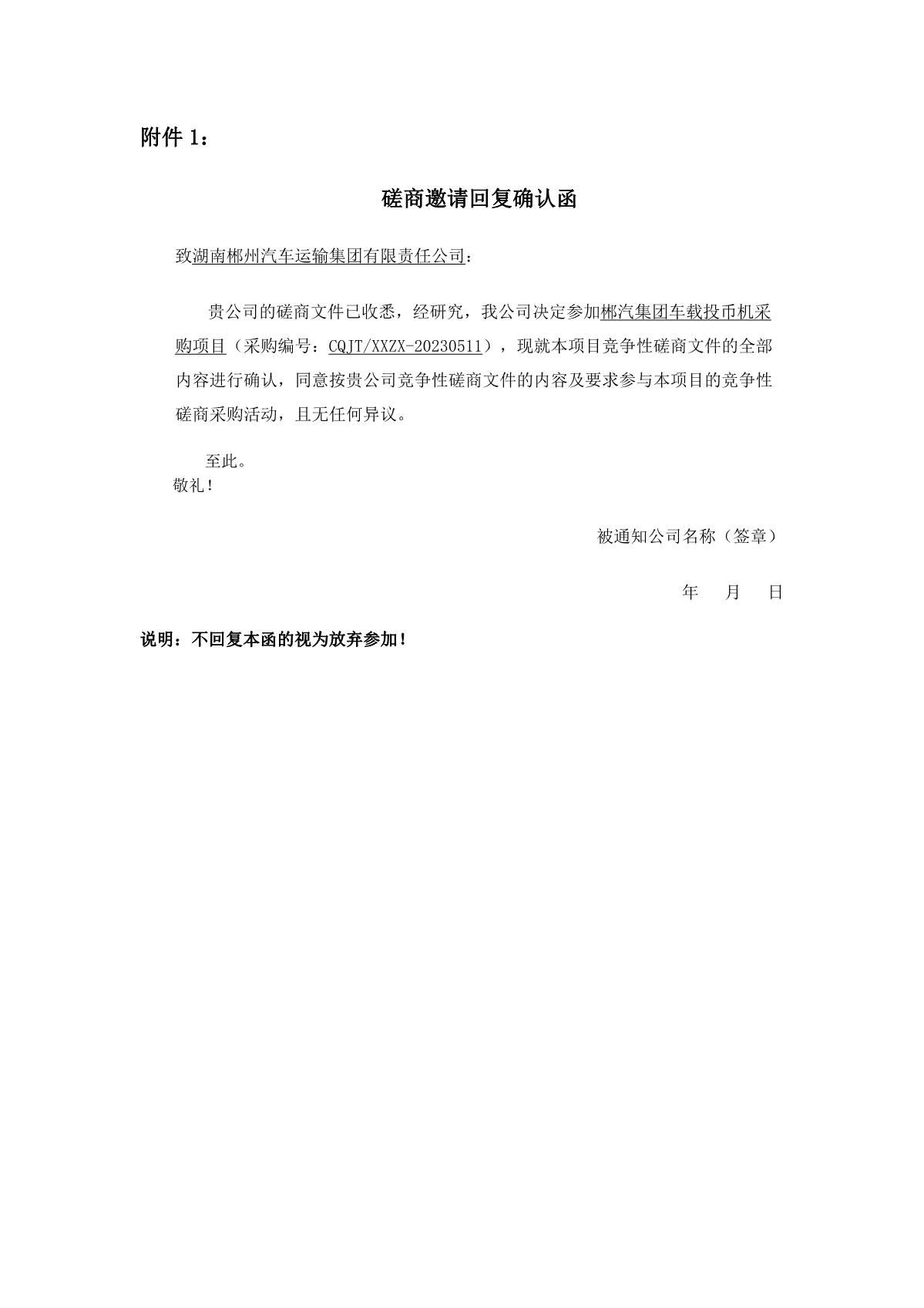 你單位收到磋商文件后,請于202352617時前來函確認是否參加競爭性磋商采購活動。若未收到你方書面確認,將視為你方已放棄參加本項目競爭性蹉商采購活動(格式見附件1)。